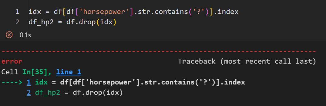 horsepower 컬럼 속 '?' 문자열이 포함된 데이터를 찾아 데이터프레임을 만들고 idx라는 변수에 할당했다.