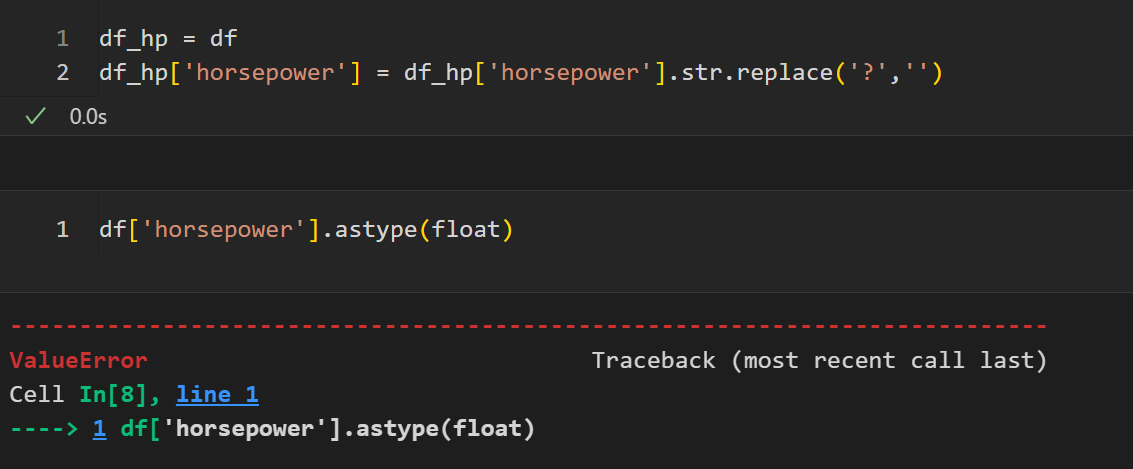 df_hp['horsepower'] 컬럼에 str.replace('?', '') 를 사용해봤다.