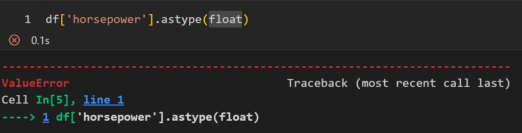df.info( )로 데이터 타입을 확인해보면 horse_power 컬럼이 object 타입임을 알 수 있다.