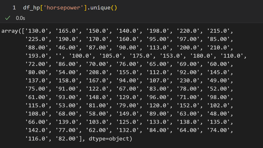 unique() 로 다시 한 번 확인해보니 horsepower 컬럼에 있던 빈값이 삭제되었다.