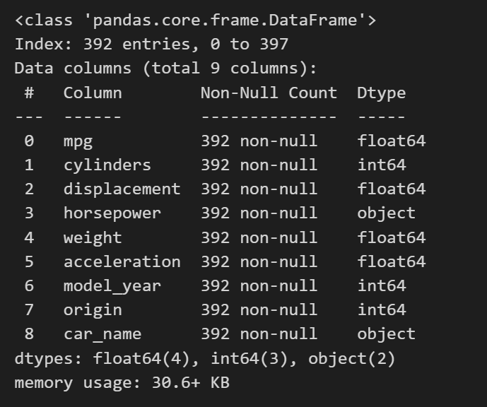 horsepower 컬럼에는 소수점이 있는 숫자형 데이터가 있으니 데이터 타입을 float로 바꾸면 좋을 것 같다.