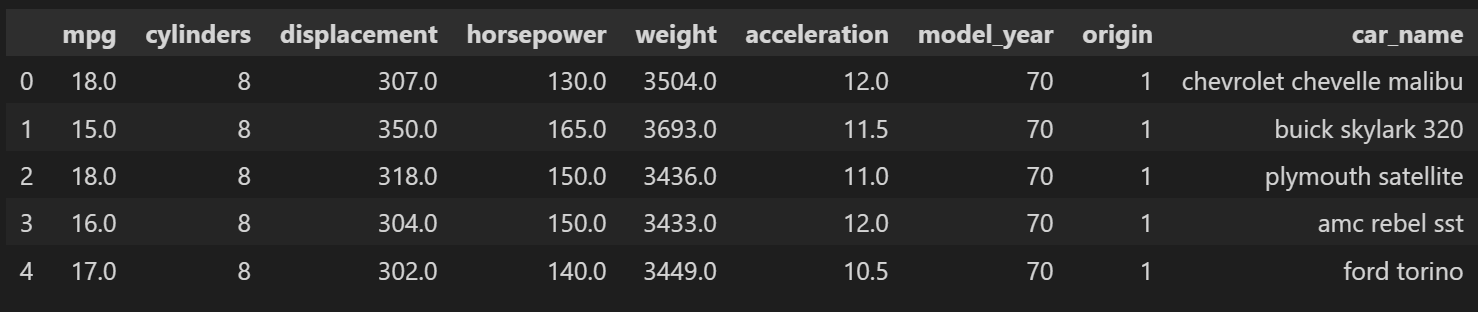 아래는 UCI 머신러닝 저장소에서 제공하는 자동차 연비 데이터(auto mpg data)로
