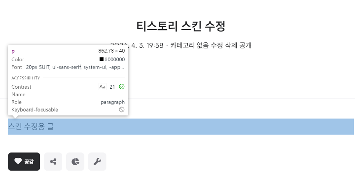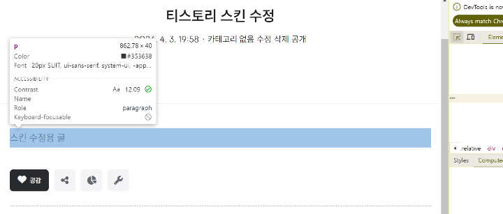 참고로 이 스킨에서는 CSS 파일의 "entry-content p" 를 찾아서 바꿔주는 방법은 통하지 않았다. 폰트 색상에 지정해둔 변수가 달라서 entry-content를 찾을 수도 없었다. 크롬 개발자모드에서 태그를 찾아봤지만 본문 텍스트는 p태그만 달려 있었다. 그렇게 시작된 노가다...