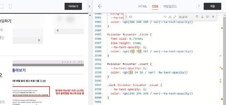 이제 블로그 관리-꾸미기-스킨편집-html 편집-CSS로 들어간다.