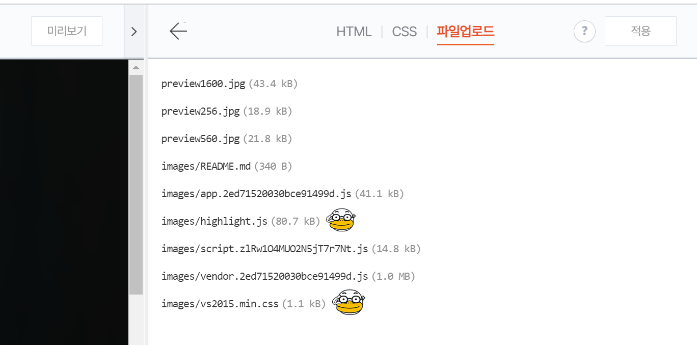 파일 압축을 해제하고 티스토리-스킨편집-HTML 편집에 들어가서 highlight.js와 테마이름.min.css파일을 업로드한다. 그리고 HTML로 돌아가서 아래의 코드를 <head> 블럭 안에 추가한다. 찾아보기 편하게 </head> 바로 위에 추가했다.