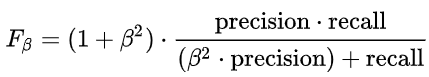 - F1 기반 평가산식 중 하나로 Beta를 매개변수로 사용해 Precision과 Recall 사이의 균형에 가중치를 부여하는 방법이다.